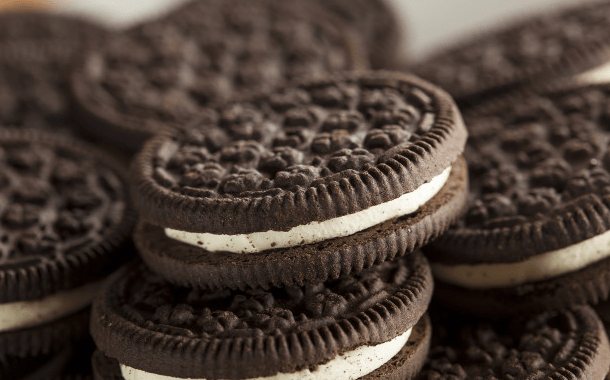 Belgian waffle topped with crushed Oreos, chocolate drizzle, and a scoop of vanilla ice cream.