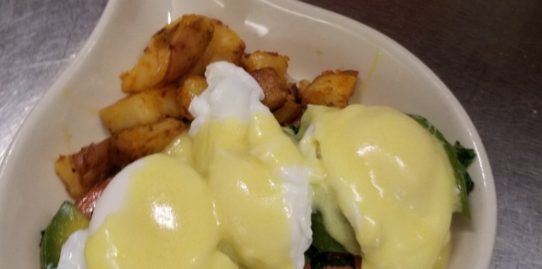 Three poached eggs over spinach tomatoes avocado and an English muffin topped with hollandaise sauce served with home fries