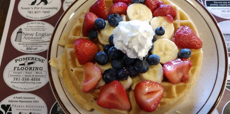 Belgian waffle with bananas strawberries and blueberries