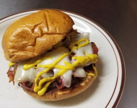 Pastrami and caramelized onions topped with swiss cheese and yellow mustard on a grilled brioche bun served with French fries or tater tots